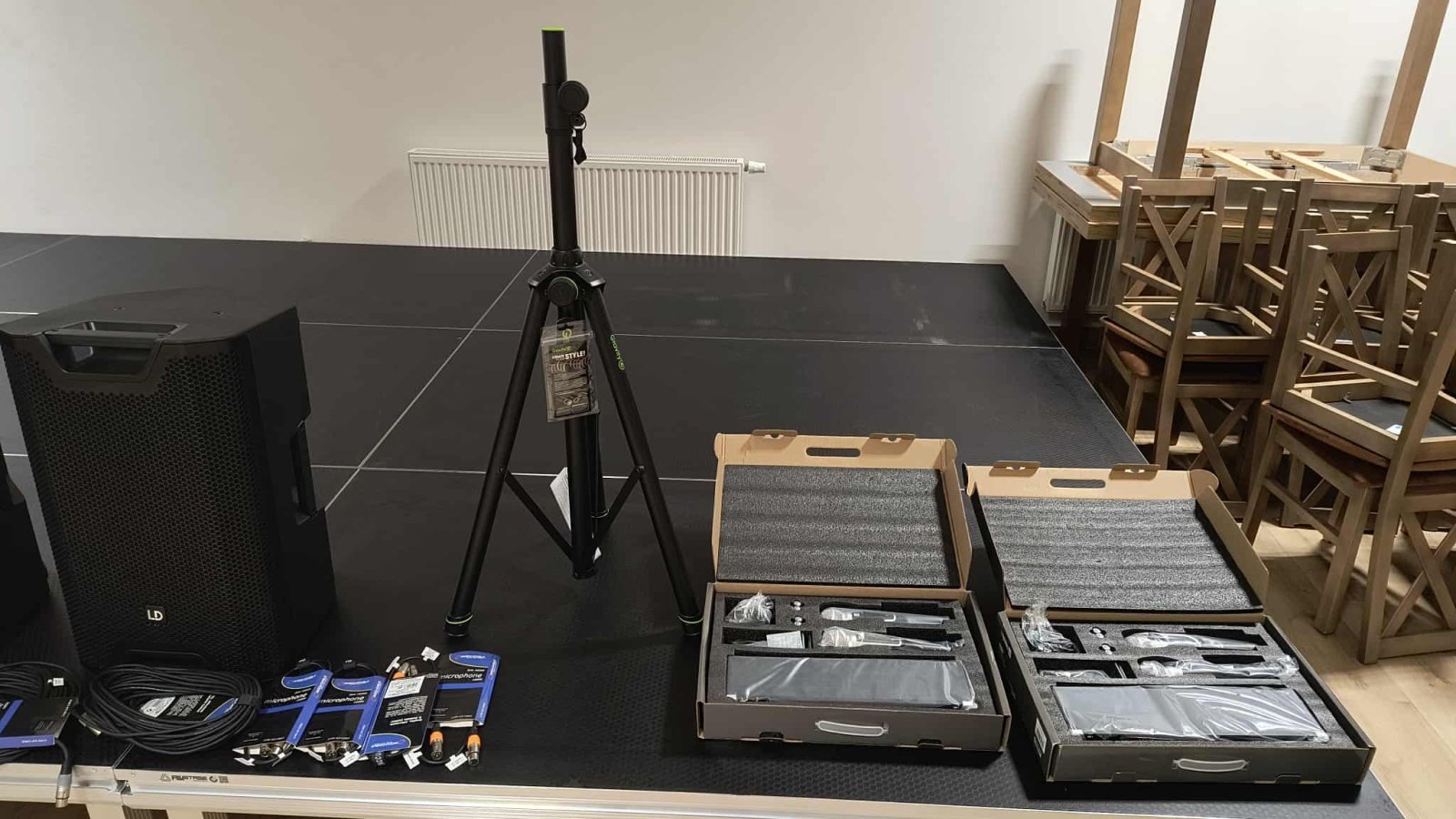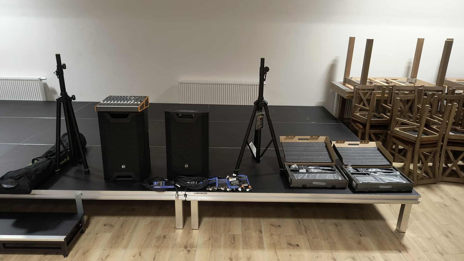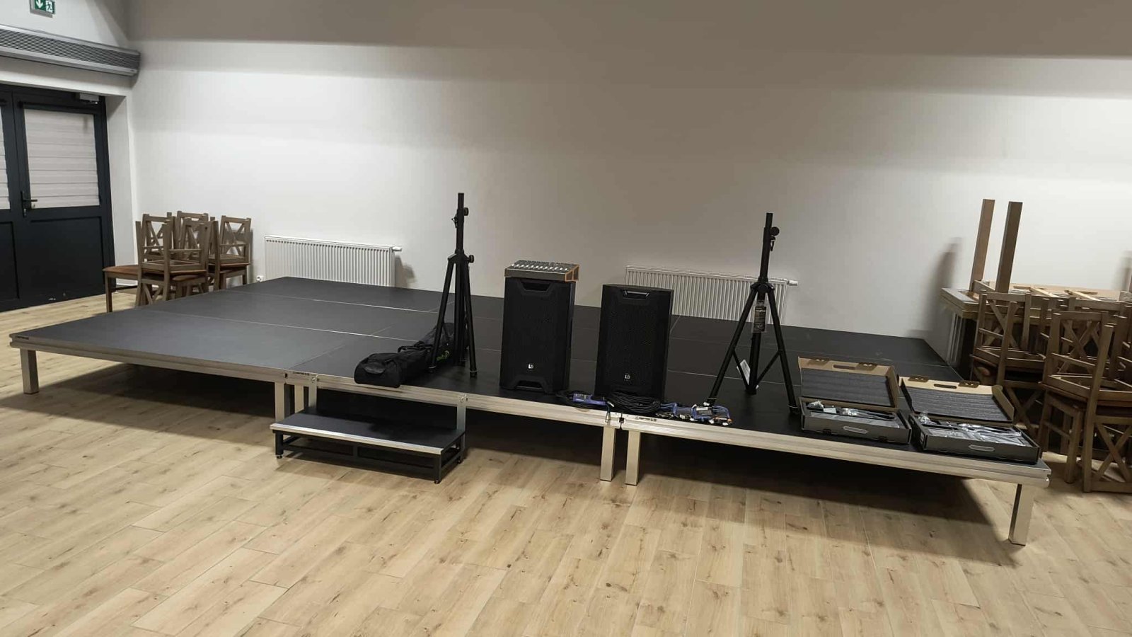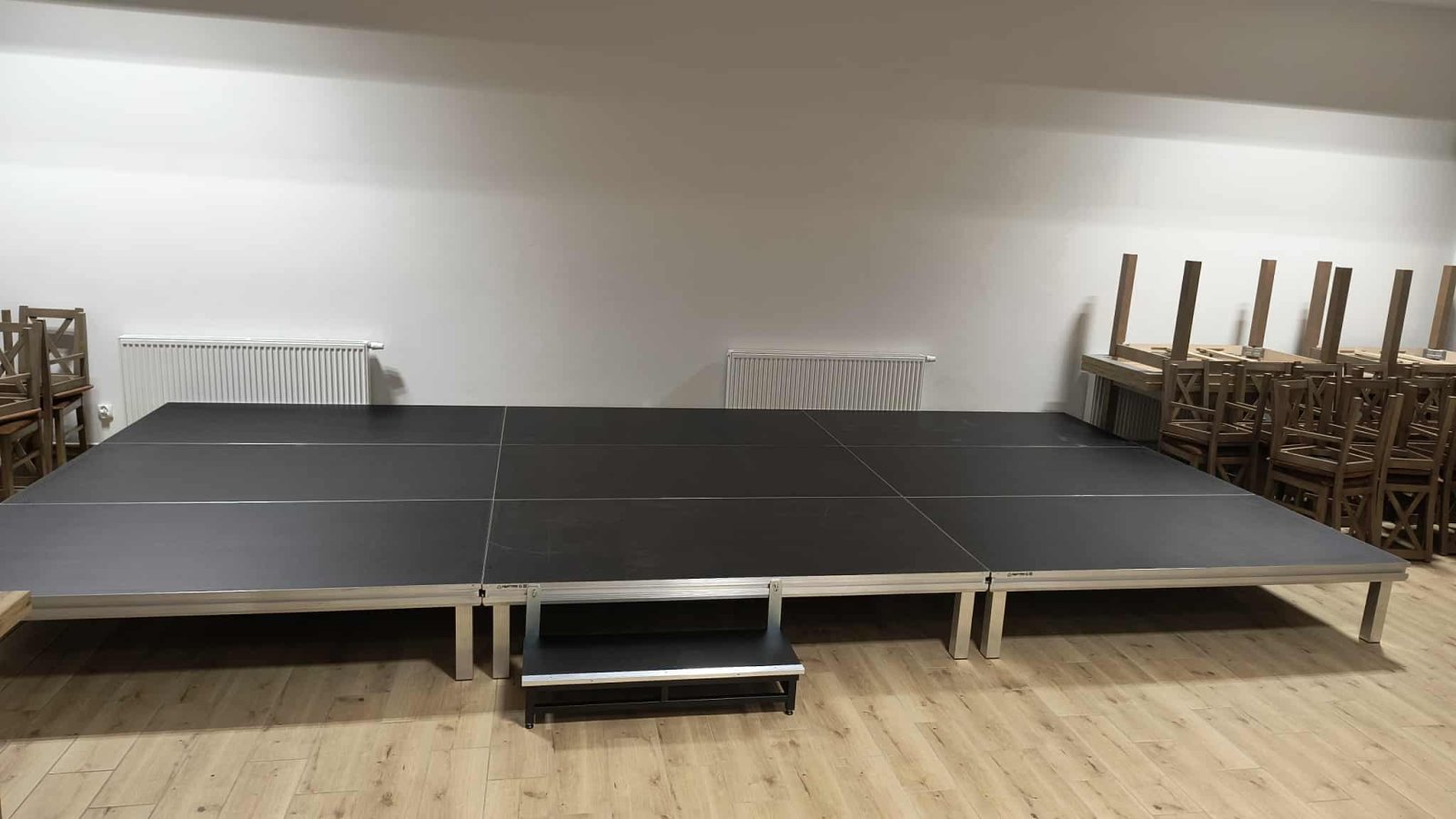 podesty sceniczne niezbędne do organizacji wydarzeń i prowadzenia zajęć.