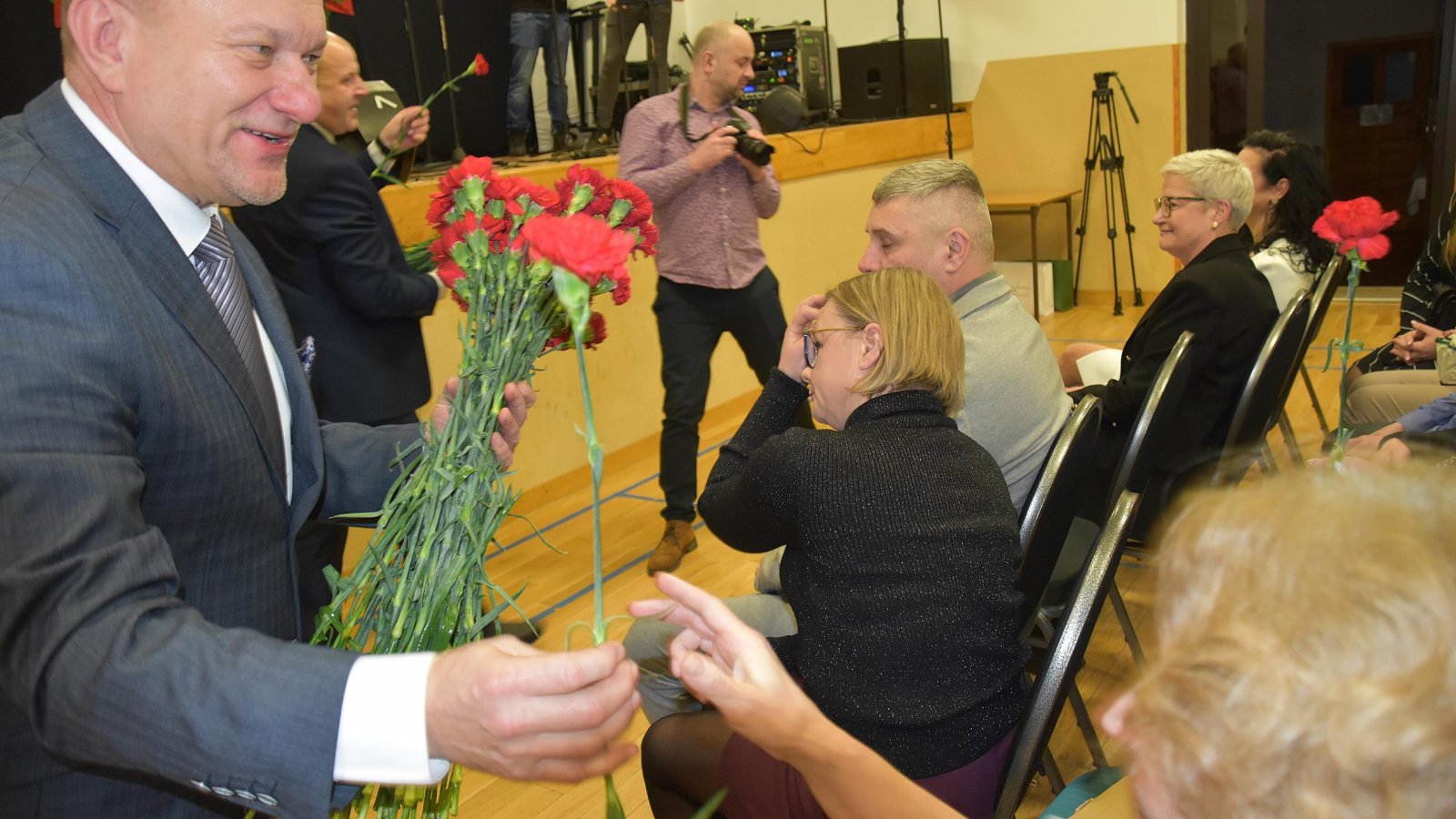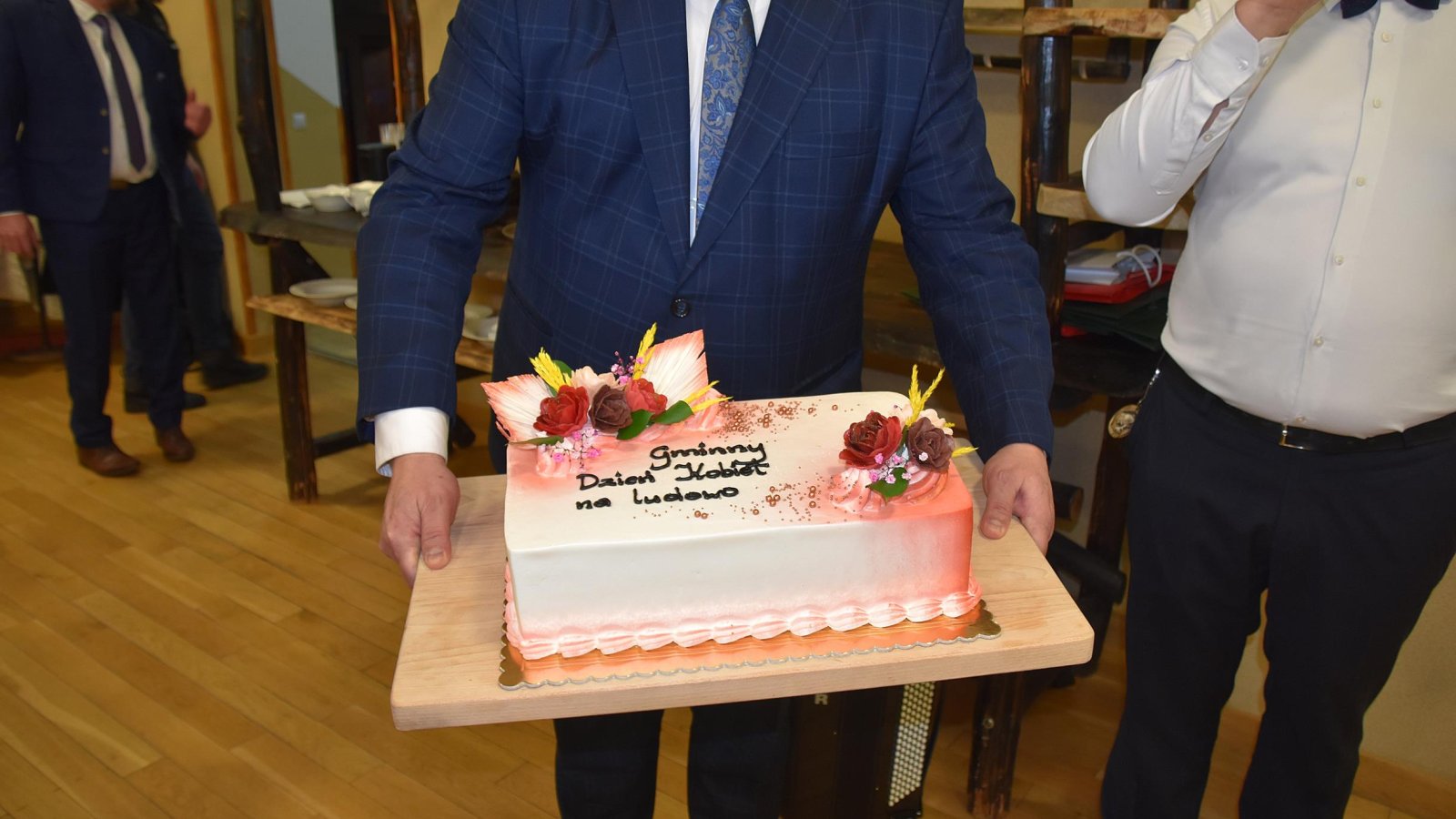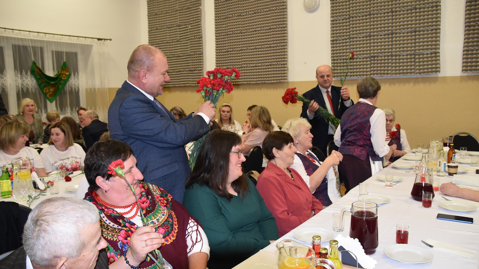 Po części artystycznej Wójt Dariusz Świerczyński wspólnie z obecnymi na sali panami, odśpiewali uroczyste „Sto lat”, co wywołało wiele wzruszeń i uśmiechów. W geście uznania Wójt wraz z Przewodniczącym Rady Gminy wręczyli wszystkim Paniom kwiaty.