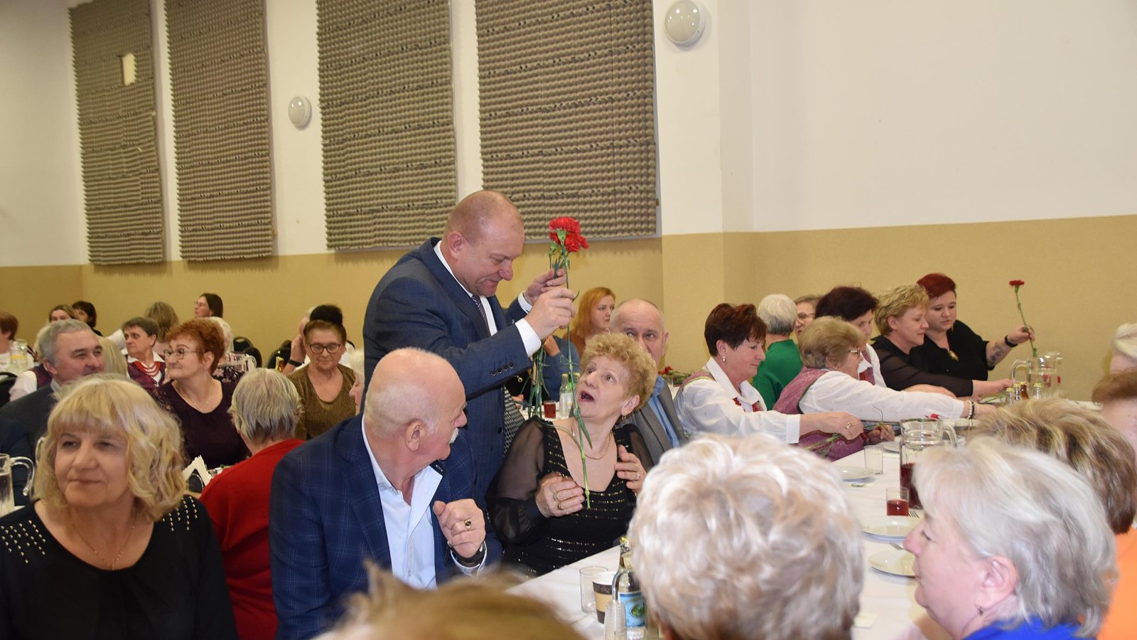 Po części artystycznej Wójt Dariusz Świerczyński wspólnie z obecnymi na sali panami, odśpiewali uroczyste „Sto lat”, co wywołało wiele wzruszeń i uśmiechów. W geście uznania Wójt wraz z Przewodniczącym Rady Gminy wręczyli wszystkim Paniom kwiaty.